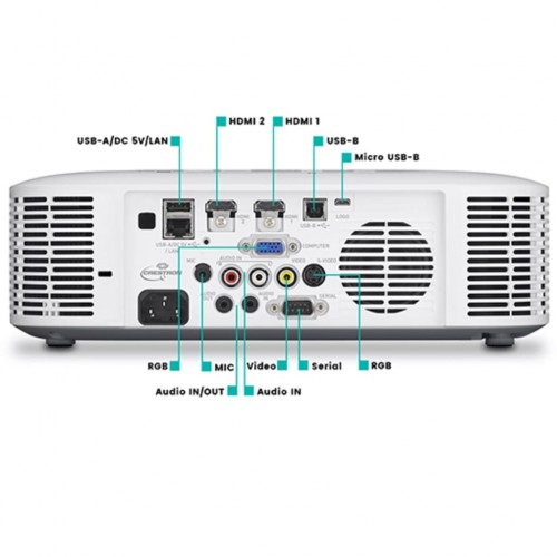 | Interface | HDMI type A × 2 mini D-Sub 15 pin × 1 YCbCr/YPbPr (used for both analog computer input and component input), Analog video: Composite (RCA) × 1 3.5 mm stereo mini jack × 1, RCA × 1 [R/L], Audio: Input: 3.5 mm monaural mini jack (for Mic.) × 1 Audio: Output: 3.5 mm stereo mini jack × 1 (variable audio) USB 2.0 Type-A × 1 for USB memory USB 1.1 Micro-B × 1 RJ-45 × 1 RS-232C (D-Sub 9pin) × 1 |