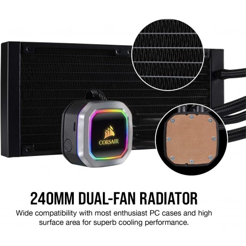 The CORSAIR Hydro Series H100i RGB PLATINUM liquid CPU cooler with a 240mm radiator & vivid RGB lighting that’s built for extreme CPU cooling. Two CORSAIR ML PRO RGB 120mm PWM fans run between 400 to 2,400 RPM, alongside an optimized cold plate and pump design that delivers the best ever Hydro Series cooling. Equipped with 24 individual RGB LEDs H100i RGB Platinum offers a wealth of RGB lighting options via Corsair iCUE software. Easy to install and compatible with all major CPU sockets, the H100i RGB Platinum pairs killer looks with chiller performance.