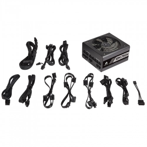 The Corsair RM750X is fully modular and optimized for silence and high efficiency. It’s built with low-noise capacitors and transformers, and Zero RPM Fan Mode ensures that the fan doesn’t even spin until the power supply is under heavy load. And with a fan that’s custom-designed for low noise operation, it’s whisper-quiet even when it’s pushed hard. 80 PLUS Gold rated efficiency saves you money on your power bill, and the low-profile black cables are fully modular, so you can enjoy fast, neat builds. And, like all Corsair power supplies, the RM750X is built with high-quality components and is guaranteed to deliver clean, stable, continuous power. RM Series power supplies are designed with capacitors and transformers carefully selected to eliminate coil whine and other background noise that can be annoying in quiet environments. The efficient design of the RM750X means minimal excess heat generation, so the fan doesn't even need to spin under low to medium loads. And when you're pushing it hard, the thermal sensor controls the fan speed to ensure that it gets the cooling it needs without any extra noise. The custom-designed fan has an optimized blade profile for low-turbulence airflow and near-silent operation even at full speed. Highly efficient RM Series power supplies produce less heat and have lower operating costs. You can use only the cables you need, and leave the rest in the box for fast, easy, and great-looking builds. Power ratings are continuous, not peak, for superior protection for your valuable PC. Corsair uses high-quality internal components, and the RM750X is served to deliver clean, stable, continuous power.