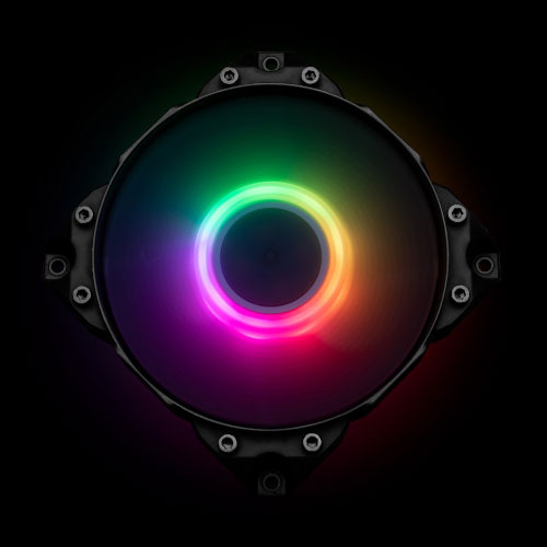 The perfectly balanced 7 fan blade design is optimized for light dispersion and high-pressure operation while maintaining the low noise profile throughout the whole operation range of the fan. This addressable D-RGB version uses a milky white rotor that does a great job of diffusing the light and provides great dispersion of all 9 LEDs located in the fan motor hub.