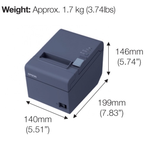 Epson TM-T82 POS thermal printer has economical print speed up to 150mm/sec, energy-star qualified, space-saving design for counter or wall mounting, 203 x 203 dpi dot density, 15 million lines printer mechanism life, 1.5 million cuts auto cutter life.