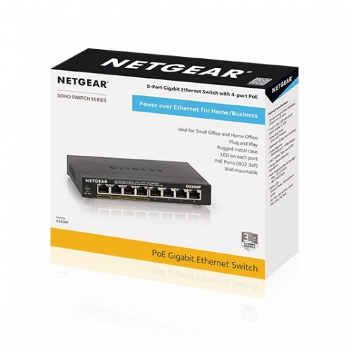 The Netgear GS308P 8-Port Gigabit Ethernet Unmanaged Switch with 4-Port PoE provides easy, reliable, and affordable network connectivity for home and small offices. With these unmanaged plug-and-play switches, you can expand your network connections to multiple devices instantly. It provides power and data from a single Ethernet (CAT-5e) cable to devices such as IP cameras, VoIP/ Internet-based phones, wireless access points, etc. The majority of these models also support the PoE power auto-balance and allocation feature. NETGEAR’s unique PoE technology automatically balances the PoE power based on the device needs independent of the PoE class detected. These switches deliver the power the device needs, at the most granular level. All ports support PoE/PoE+ up to 30W per port, which makes them the perfect switches for deploying Wireless APs, Pan/ Tilt/Zoom and fixed IP Cameras, VoIP Phones, access-limited security door locks, or any other IoT PoE-powered devices. It comes with a 1-year warranty.