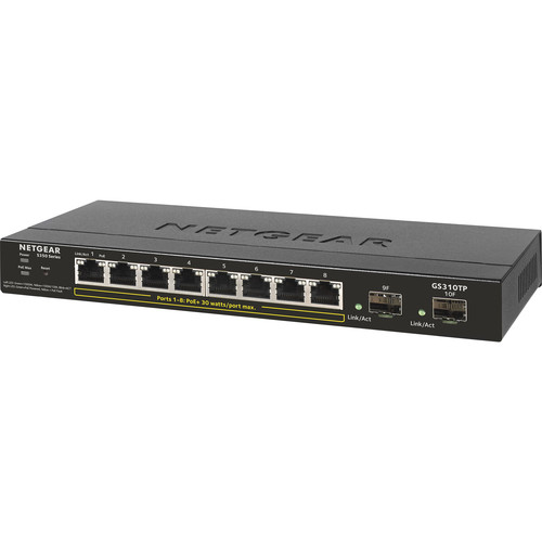 Boost your business's network switching capacity with the GS310TP S350 Series 8-Port Gigabit PoE Smart Managed Switch from Netgear. Boasting a switching bandwidth up to 20 Gb/s and a packet forwarding rate up to 14.8 Mpps, the GS310TP comes equipped with eight Gigabit Ethernet ports and two Gigabit SFP ports. The eight Gigabit Ethernet ports support PoE+ (Power over Ethernet), ideal for transmitting data and power over a single cable, with a total PoE budget of 55W. 802.1x support helps to ensure secure access for authorized users, while 802.1p-based prioritization helps to optimize network performance by prioritizing business-critical traffic. A web-based UI allows for remote management, while the switch's fanless design helps to ensure quiet operation.