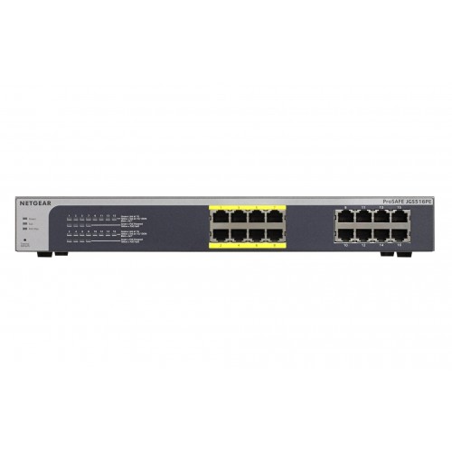 Netgear JGS516PE 16-port Gigabit Ethernet switch with 8 PoE ports (802.3af) providing up to 15w per port with 85w total PoE power budget. ESSENTIAL NETWORKING - Segment and prioritize your traffic with VLAN, QoS, IGMP Snooping, rate limiting and traffic monitoring. Monitor your network status and your cabling with the port statistics and cable health. DESKTOP / 1U Rack mountable form factor. Jumbo frame support. 16 Gigabit Ethernet ports deliver up to 2000 Mbps of dedicated, non-blocking bandwidth per port